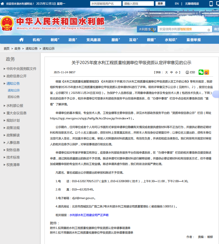 喜報|湖北華旭檢測有限公司順利通過水利部兩項甲級檢測資質(zhì)公示